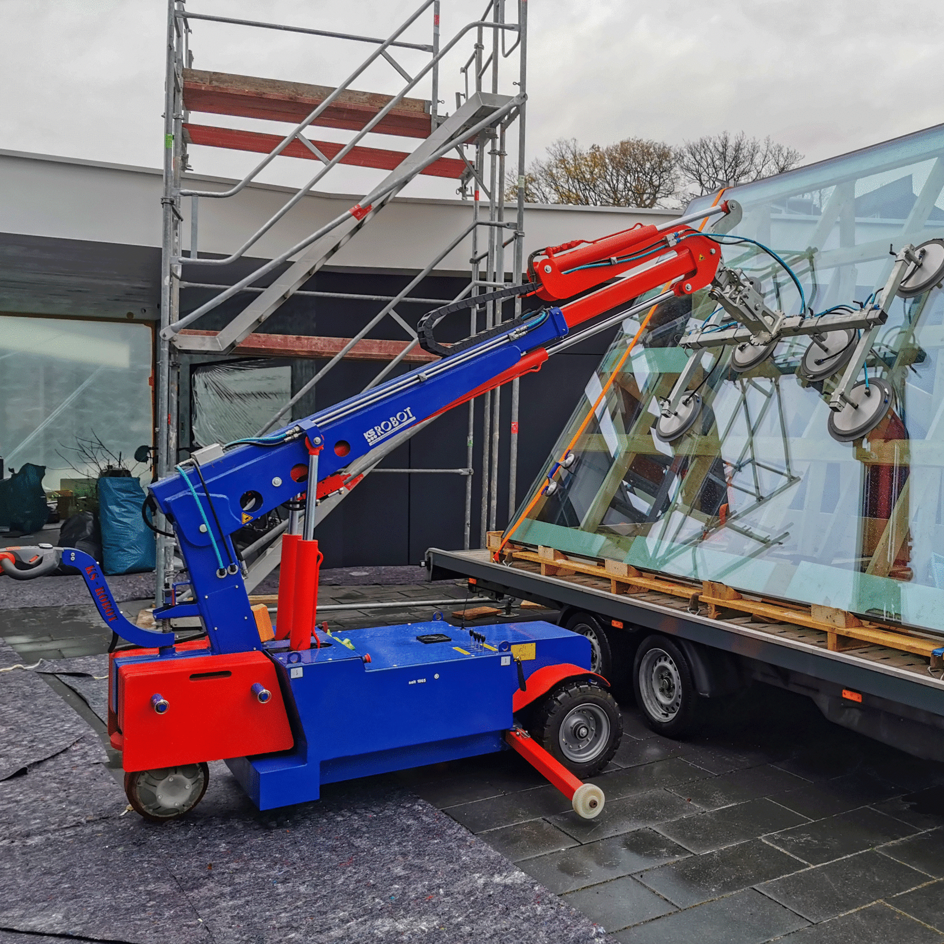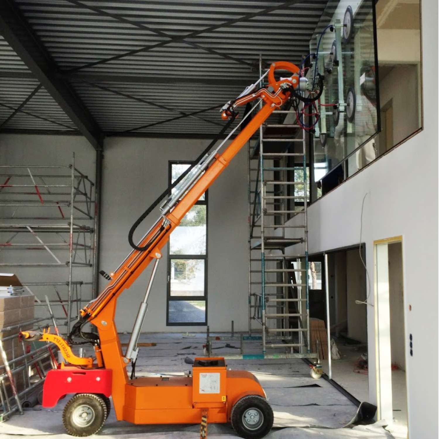 Der Glas-Robot KS-1000 ist der Gigant unter den KS Hebefahrzeugen. Elemente bis zu einer Tonne können ihm nichts anhaben. Damit das Handling mühelos gelingt, ist er mit einem servogesteuerten Hydraulikantrieb und Proportionalventilen ausgestattet.